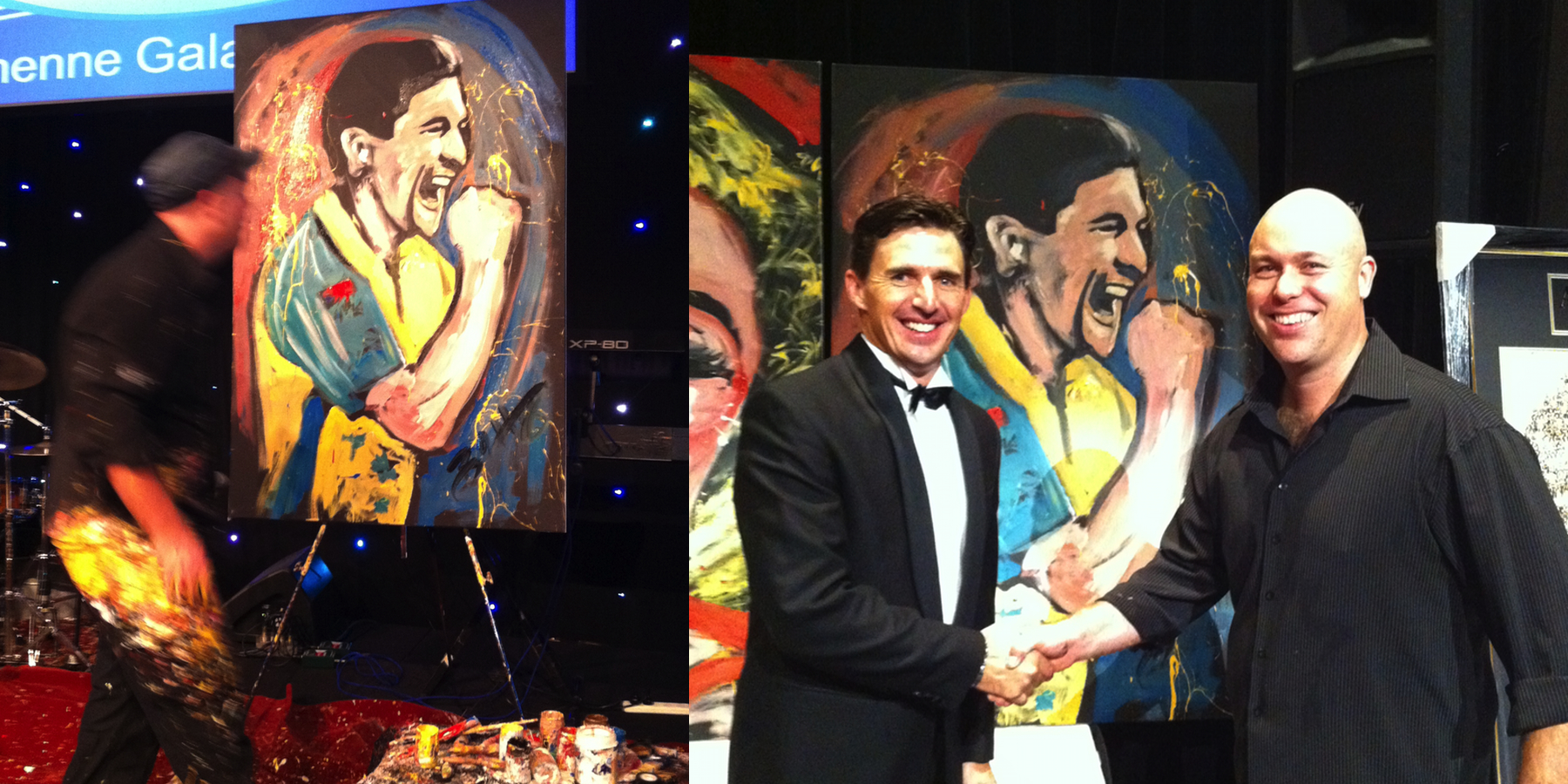 PHOTO: Aussie Cricketer Brad Hogg and speed painter Brad Blaze at a charity event in Perth, Western Australia.
